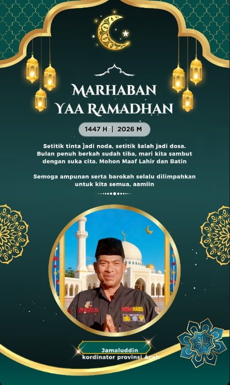 Jamaluddin (Pak Nek), Koordinator Provinsi Aceh dari Media Mitra Mabes dan lingkaran polri mengucapkan selamat menunaikan ibadah puasa 1447 Hijriah kepada seluruh umat Islam di Aceh khususnya dan seluruh masyarakat Indonesia pada umumnya.