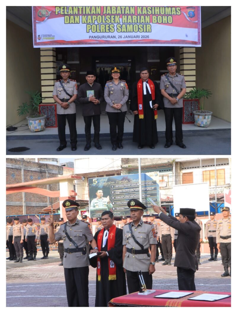 SAMOSIR – SUMUT, MBS – Kapolres Samosir AKBP Rina Sry Nirwana Tarigan, S.I.K secara resmi melantik Kasi Humas dan Kapolsek Harian Boho Polres Samosir dalam upacara pelantikan jabatan yang digelar di halaman apel Mako Polres Samosir, Senin (26/1/2026) sore.