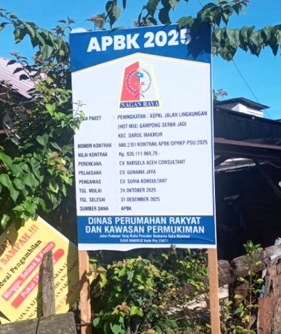 Proyek Peningkatan Jalan Lingkungan Desa Serba Jadi kecamatan Darul Makmur ( Aspal Hot Mik) dengan No kontrak: 600.2/01/Kontrak/ APBK/ DPRKP. PSU /2025 ” Nilai kontrak Rp.926.111.969.79,- Perencana CV Barsela Aceh Consultant” Pelaksana CV Gunama Jaya” Pengawas CV Sivia Consultant” Tanggal Mulai 24 Oktober 2025″ Tanggal selesai 31 Desember 2025″ Sumber dana APBK ” dinas Perumahan Rakyat dan kawasan Pemukiman.