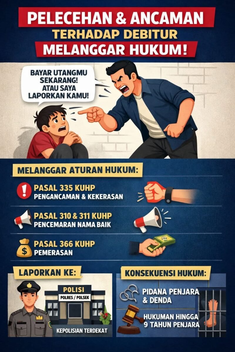 * Pasal 310 dan 311 KUHP, mengenai pencemaran nama baik, termasuk menyebarkan tuduhan atau aib debitur kepada pihak lain.