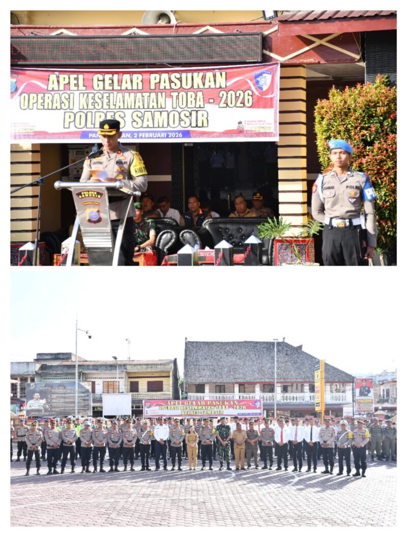 SAMOSIR — SUMUT,MBS – Polres Samosir menggelar Apel Gelar Pasukan dalam rangka Kesiapan Akhir Operasi Keselamatan Toba 2026, Senin (2/2/2026) pagi. Kegiatan yang dimulai pukul 07.00 WIB tersebut berlangsung di Lapangan Mako Polres Samosir dan dipimpin oleh Wakapolres Samosir, Kompol Briston A.M. Napitupulu, S.T., S.I.K.