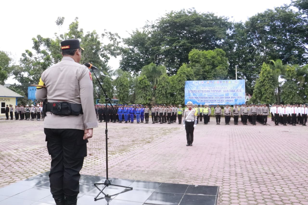 Dalam rangka memastikan kesiapan pengamanan Perayaan Natal Tahun 2025 dan Tahun Baru 2026, Polres Langkat menggelar Apel Gelar Pasukan Operasi Kepolisian Terpusat Lilin Toba 2025 di Lapangan Jananuraga Polres Langkat, Jumat (19/12/2025) sore.