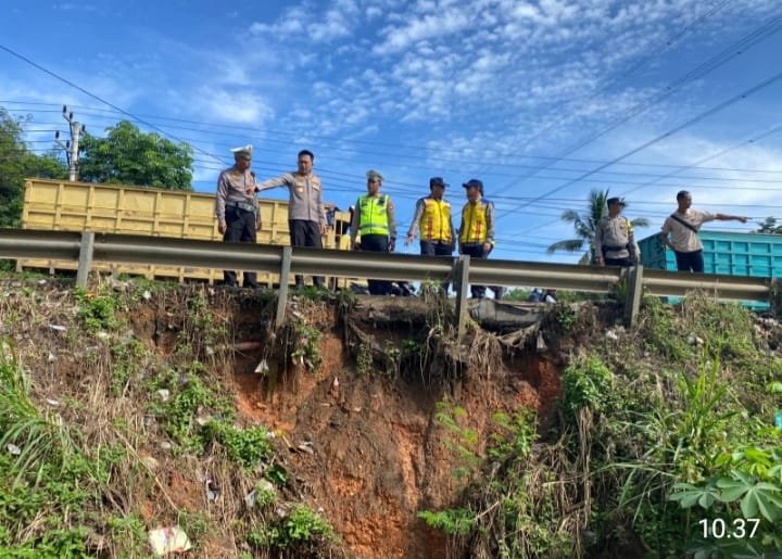 “Kerusakan bahu jalan ini harus segera ditangani untuk mencegah longsor berkembang ke badan Jalintim. Kami mendorong percepatan penanganan karena ini menyangkut keselamatan masyarakat,” ujar AKBP Ruri Prastowo, S.H., S.I.K., M.I.K. di lokasi.