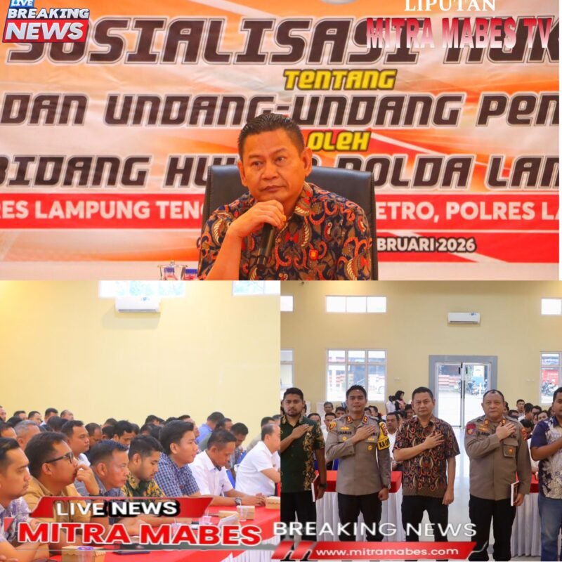 Lampung Tengah Mitra Mabes.Com – Bidang Hukum (Bidkum) Polda Lampung menggelar kegiatan sosialisasi KUHP, KUHAP dan Undang-Undang Penyesuaian Pidana di Polres Lampung Tengah, Jumat (13/2/26).