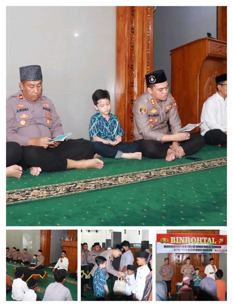 Mitramabes.com – Nganjuk – Polres Nganjuk menggelar kegiatan Pembinaan Rohhani dan Mental (Binrohtal) yang dirangkaikan dengan santunan kepada anak yatim piatu, dipimpin langsung Kapolres Nganjuk AKBP Suria Miftah Irawan, S.H., S.I.K., M.I.K., di Masjid Al-Ikhlas Polres Nganjuk, Jumat (20/2/2026).