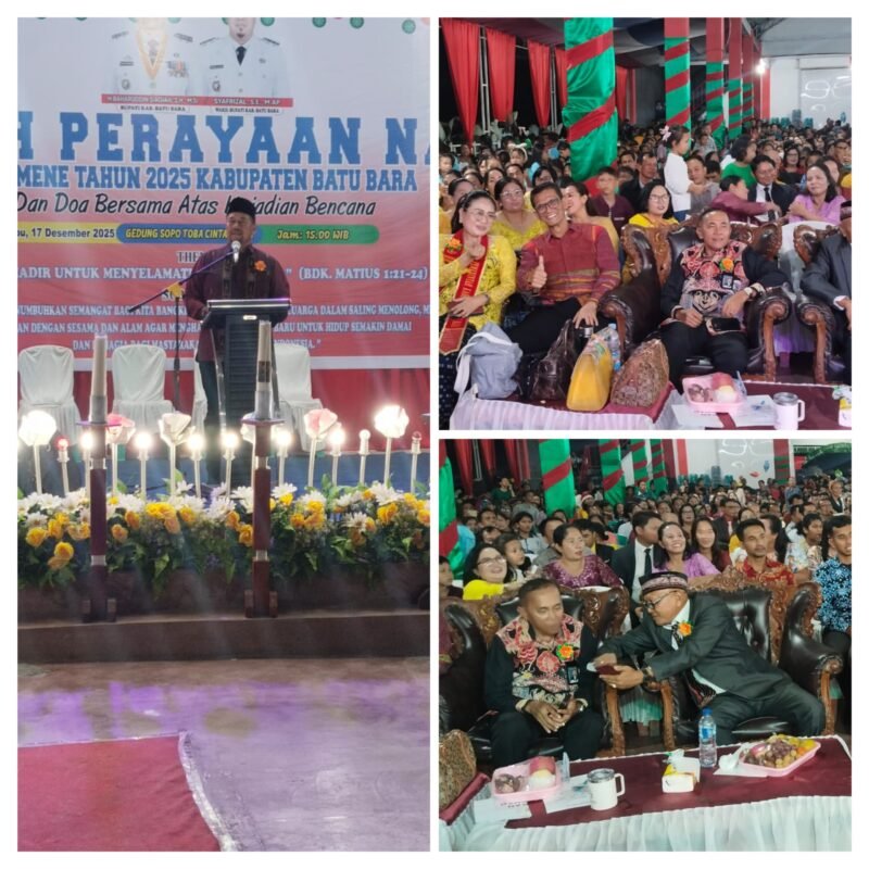 Mbs.com- Sumatera Utara, Batubara- Bupati Kabupaten Batubara, H. Baharuddin Siagian, SH., M.Si menghadiri Ibadah dan Perayaan Natal Oikumene Kabupaten Batubara Tahun 2025 yang berlangsung khidmat dan penuh sukacita pada Rabu, 17 Desember 2025, pukul 15.00 WIB di Sopo Toba, Desa Cinta Dame, Kecamatan Air Putih.
