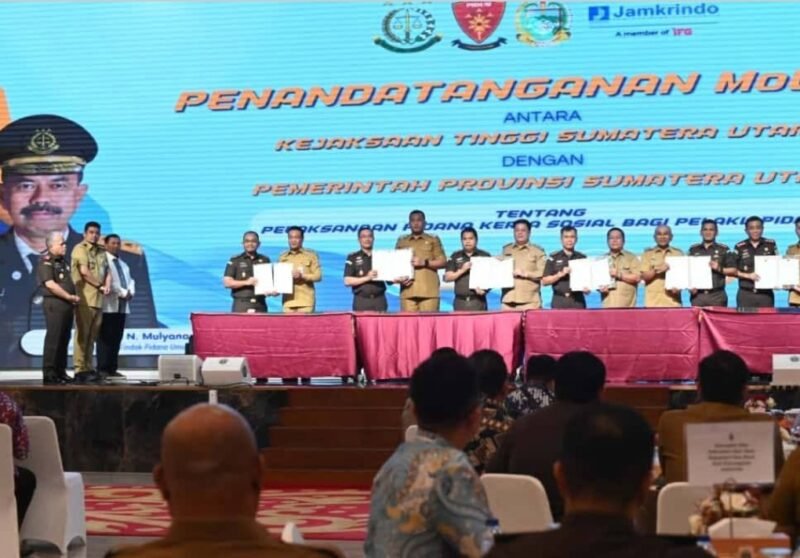 Bupati Humbang Hasundutan Dr Oloan Paniaran Nababan SH MH bersama Kajari Humbang Hasundutan Donald Togi Joshua Situmorang SH MH tandatangani naskah kerjasama terkait Pelaksaaan Pidana Kerja Sosial Bagi Pelaku Pidana bertempat di Aula Raja Inal Siregar Kantor Gubernur Sumatera Utara Jalan Iman Bonjol Medan, Selasa 18 November 2025.