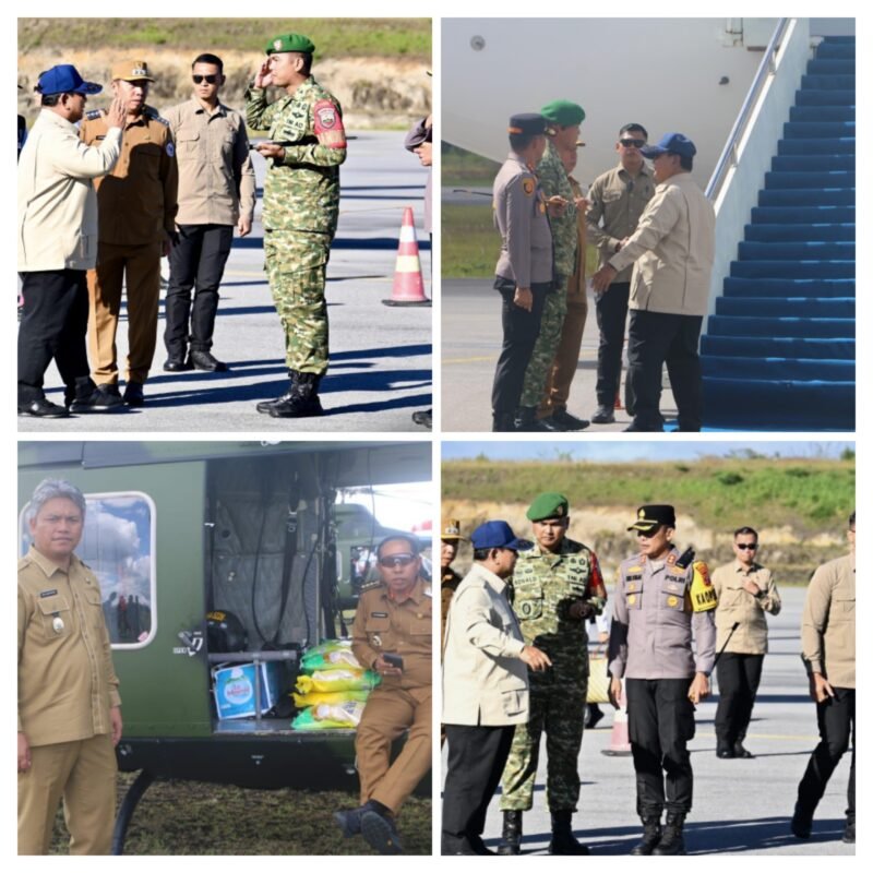 Bupati Tapanuli Utara Dr. Jonius Taripar Parsaoran Hutabarat, S.Si, M.Si bersama Kapolres Taput AKBP Ernis Sitinjak, S.H, S.IK, serta Dandim 0210/TU Letkol Kav Ronald Tampubolon, S.H, M.Han menyambut kunjungan Presiden Prabowo Subianto dalam rangka meninjau dampak bencana banjir dan longsor di Wilayah Tapanuli bertempat di Bandara Silangit, Siborong-borong, Senin (01/12/2025).