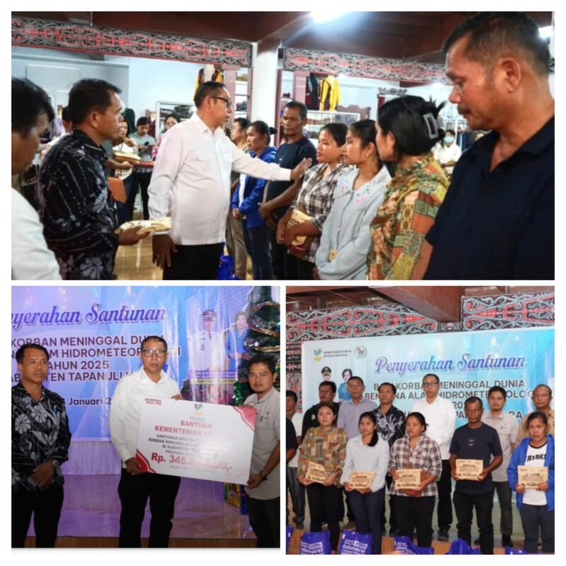 Bupati Tapanuli Utara Dr. Jonius Taripar Parsaoran Hutabarat, S.Si, M.Si menyerahkan santunan kepada 23 ahli waris korban meninggal dunia akibat bencana hidrometeorologi yang terjadi sepanjang tahun 2025 di Kabupaten Tapanuli Utara bertempat di Kantor Dekranasda Kabupaten Tapanuli Utara, Tarutung. (Sabtu, 24 Januari 2026).