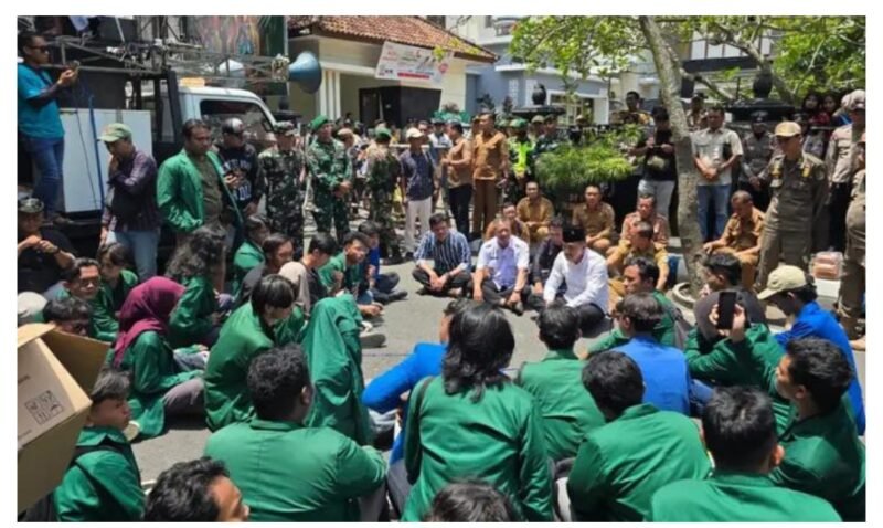 Tulungagung MBS Com. Bupati Tulungagung, H. Gatut Sunu Wibowo, S.E., M.E., menemui ratusan mahasiswa yang menggelar aksi unjuk rasa di depan Gedung DPRD Tulungagung pada Senin (29/9/2025). Bupati Gatut Sunu didampingi Sekda Tulungagung, H. Drs. Tri Hariadi, serta jajaran Forkopimda.