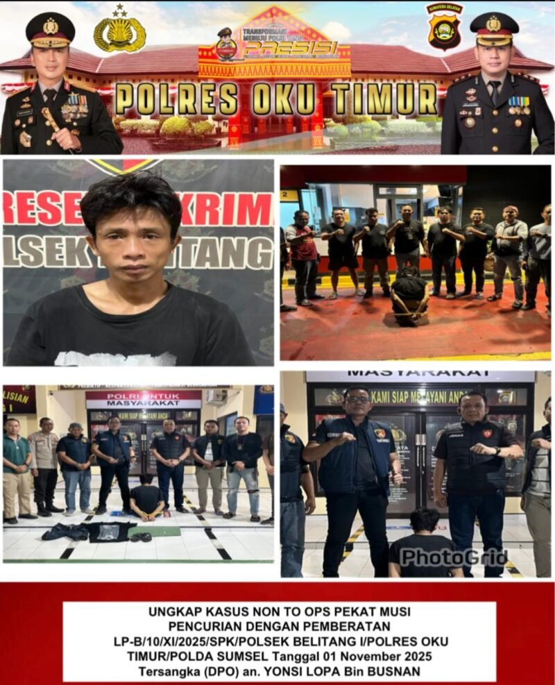 Palembang – Komitmen tegas penegakan hukum kembali dibuktikan jajaran Polda Sumsel. Tim gabungan Polsek Belitang I bersama Jatanras Polda Sumsel berhasil menangkap seorang Daftar Pencarian Orang (DPO) kasus pencurian sepeda motor di lingkungan Gereja HKBP Belitang, Kabupaten OKU Timur.