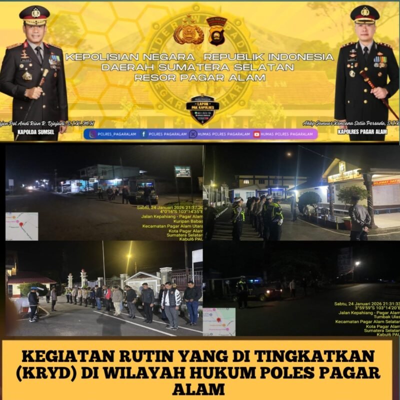 Pagaralam – Untuk menjaga stabilitas keamanan dan ketertiban masyarakat (kamtibmas), personel gabungan Polres Pagar Alam kembali melaksanakan Patroli Kegiatan Rutin Yang Ditingkatkan (KRYD) di wilayah Kota Pagar Alam, Sabtu Malam (24/01/2026) Sekira pukul 21.00 Wib.