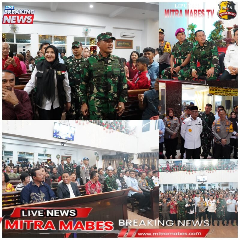 Bandar Lampung Mitra Mabes.Com – Danrem 043/Garuda Hitam Brigjen TNI Haryantana, S.H., bersama Forkopimda Provinsi Lampung melaksanakan patroli dan pemantauan pengamanan Malam Natal 2025 di sejumlah gereja dan Pos Pengamanan Natal di wilayah Kota Bandar Lampung, Rabu malam (24/12/2025).