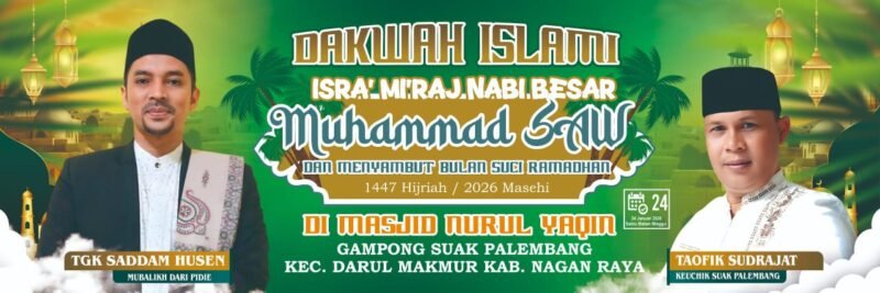 Suka Makmue- Mitramabes.com” Pemerintahnya Desa Suak Palembang melaksanakan acara kegiatan isra mi’raj Nabi Muhammad SAW pada hari Sabtu 24/ 01/2026 tepatnya malam Minggu pukul 22,00 wib di masjid Nurul Yakin”Sabtu 24Januari 2026