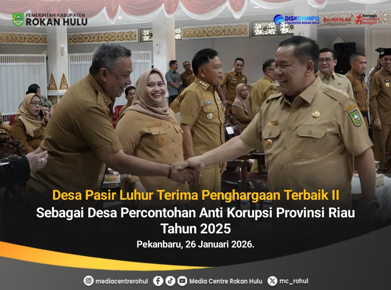 Dengan penghargaan ini, Bupati Anton berharap Desa Pasir Luhur dapat menjadi laboratorium pembelajaran bagi desa-desa lain di Rokan Hulu agar tercipta pemerintahan yang bersih, berintegritas, dan berkelanjutan di seluruh Negeri Seribu Suluk. (Kominfo/JK).