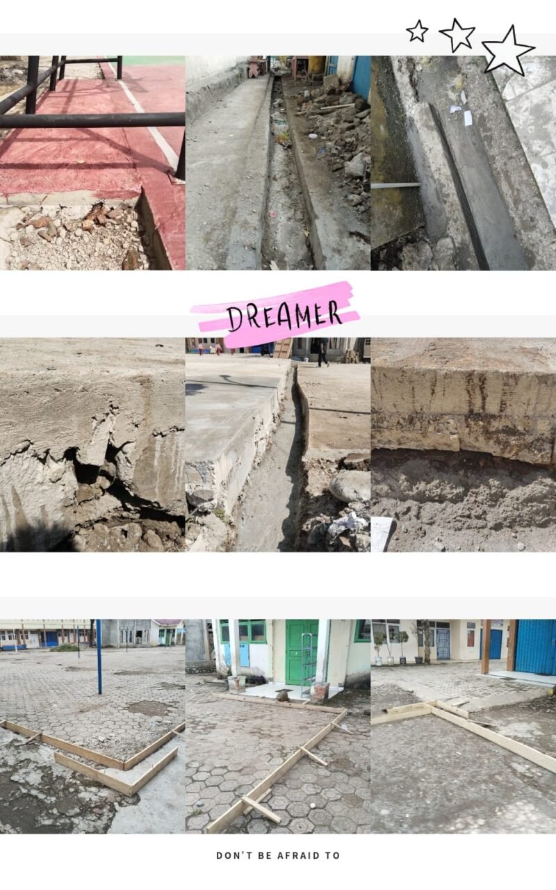 ​Ketiadaan Pondasi yang Layak: Hasil observasi video menunjukkan bahwa struktur beton hanya menumpang di atas material lama (paving blok/bata) dengan rongga kosong di bawahnya, tanpa adanya struktur pondasi atau pengerasan tanah dasar yang memadai. Hal ini berisiko tinggi menyebabkan bagunan amblas atau retak dalam waktu singkat.
