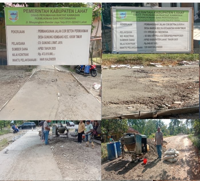 Selain dari itu, Tim investigasi juga menemukan proyek APBD Pembangunan jalan Cor Beton Dusun 4 Desa Marga Mulya kecamatan Kikim timur, Pekerjaan Dinas PRKPP kabupaten Lahat dengan nilai kontrak Rp.946.657.000. dikerjakan oleh CV.Kreasi Mu Indonesia.
