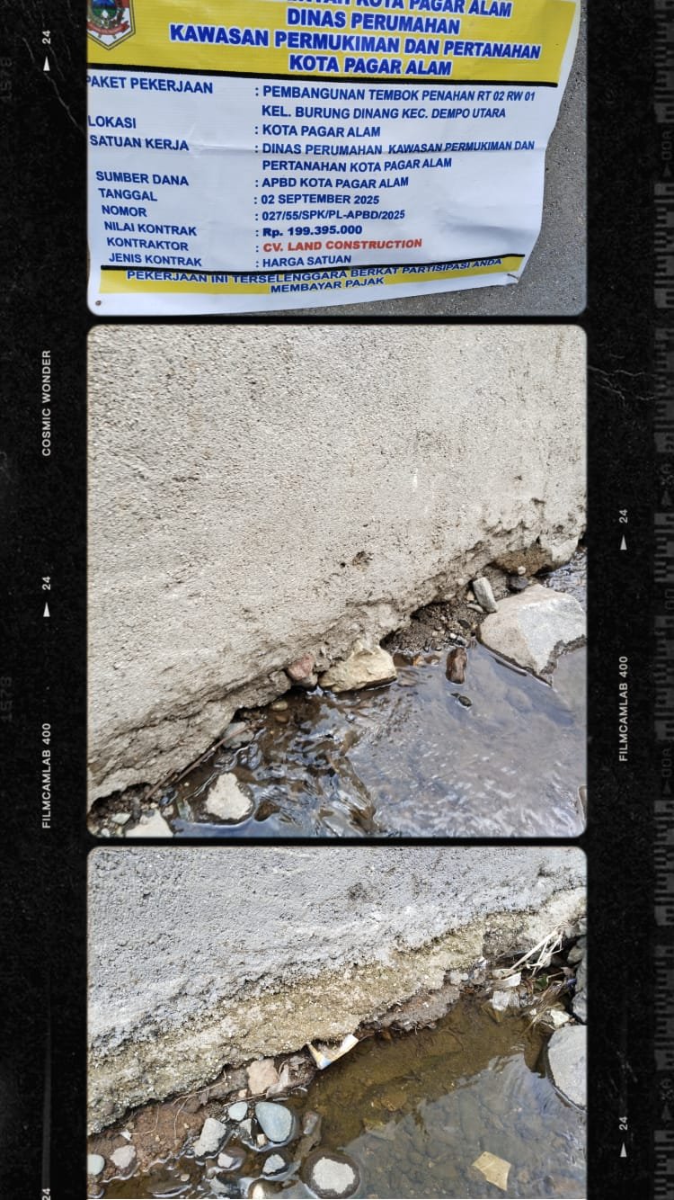 Pagar Alam -Sumatra Selatan -28-10-2025, Dugaan Penyimpangan Pelaksanaan Pembangunan Tembok Penahan RT. 01. RW. 01 yang terletak di Dusun Talang Darat Kelelurahan Burung Dinang Kecamatan Dempo Utara Kota Pagar Alam , Provinsi Sumatera Selatan dikerjakan asal jadi.