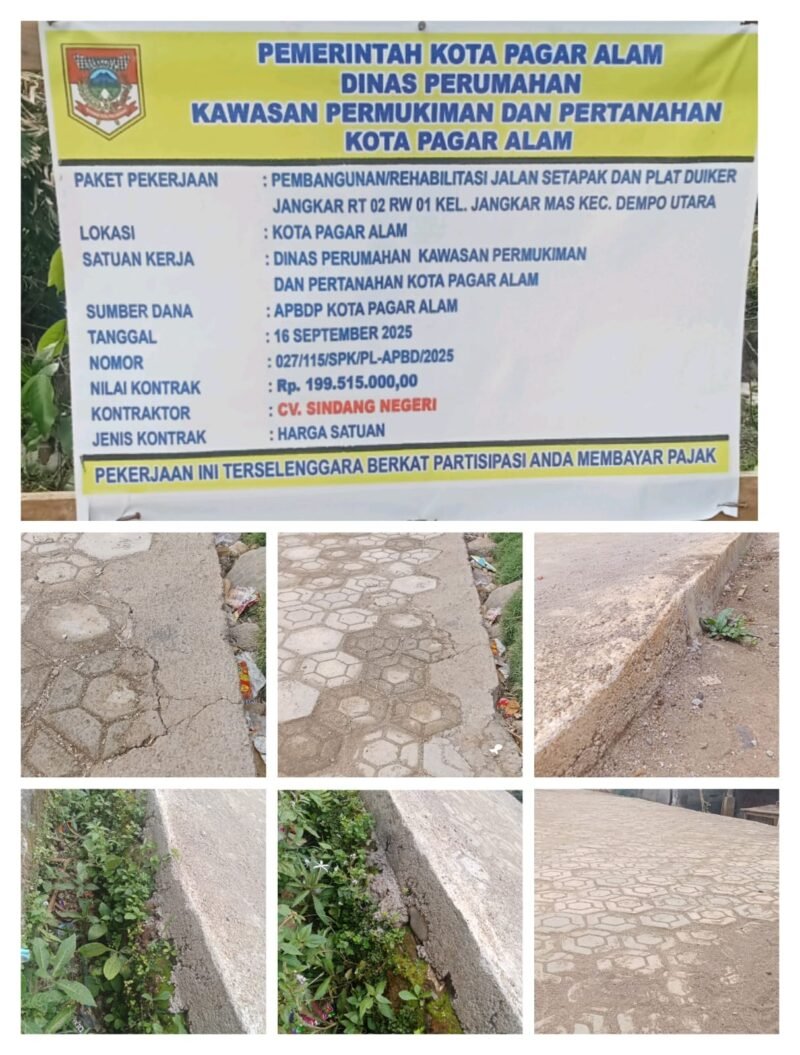 Jalan yang di bangun menggunakan dana APBD Kota Pagaralam. CV. SINDANG NEGERI Nomor: 027/115/SPK/PL-APBD/2025 Yang nilai kontrak kurang lebih Rp. 199,151,000.(Dua ratus jutah rupiah) Adanya indikasi tersebut, berdasarkan temuan awak media yang melihat langsung kelapangan, menemukan adanya pembangunan yang tidak sesuai Sefecsifikasi, dimana pemasangan Pavink Blok yang tidak merata, yang di akibatkan tidak adanya galian C. Atau menimpa bangunan coran lama yang sudah ada sebelumnya.