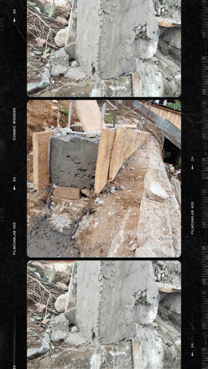 Struktur Kolom dan Bekisting: Penggunaan papan kayu (bekisting) untuk kolom terlihat kurang rapi dan berisi. Selain itu, ada bagian struktur yang tampak hanya bertumpu pada susunan bata merah atau tanah tanpa pondasi dalam yang memadai.