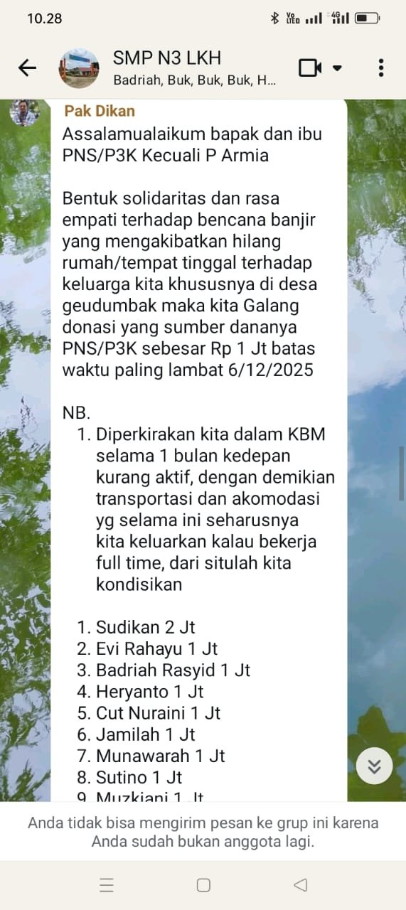 Dugaan tindakan tidak adil mencuat di lingkungan SMP Negeri 3 Langkahan, Kabupaten Aceh Utara. Seorang guru berstatus Pegawai Pemerintah dengan Perjanjian Kerja (PPPK) berinisial M diduga dikeluarkan dari grup WhatsApp resmi sekolah dan dinonaktifkan dari tempat tugasnya setelah tidak sanggup mengikuti donasi internal sebesar Rp1 juta untuk korban banjir.