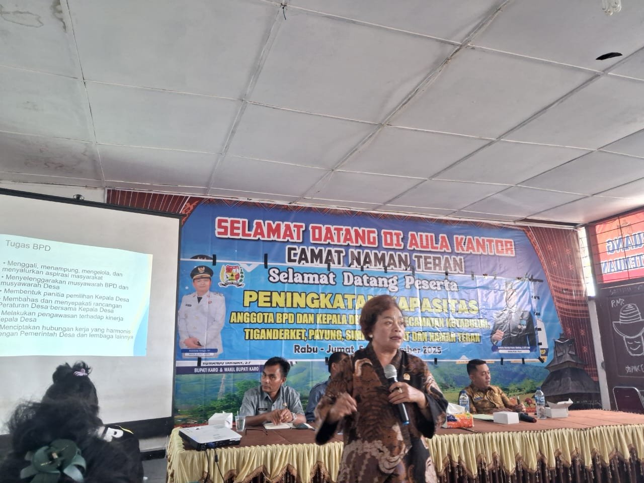 “Jumat, 7 November 2025 hari terakhir kegiatan pembekalan ini di adakan di Aula Kantor Kecamatan Namanteran. Hadir sebagai pemateri diantaranya, Andy Sinuhaji Kabid administrasi pemerintahan desa Dinas PMD Kabupaten Karo, Anggota Komisi A DPRD Kabupaten Karo Dra Lusia Br Sukatendel, Camat Simpang Empat Binaria Surbakti, sementara Camat Naman Teran terpantau tidak ikut hadir dalam kegiatan ini.