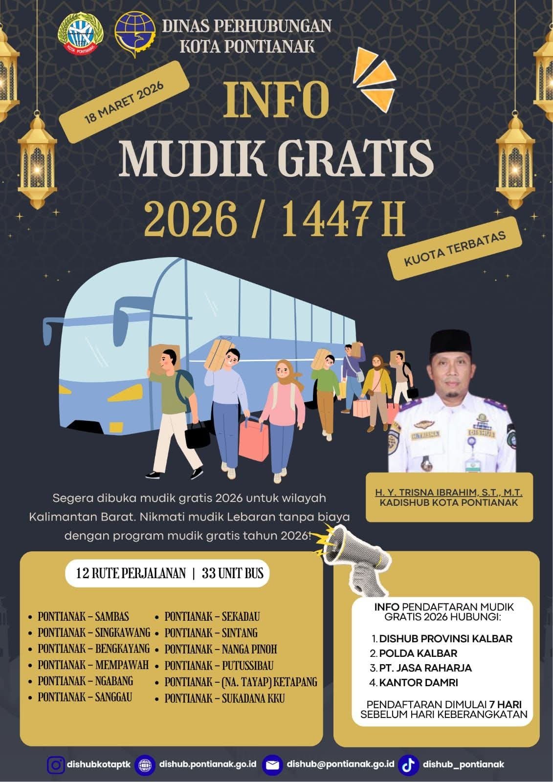 Pemerintah Kota Pontianak melalui Dinas Perhubungan Kota Pontianak kembali menunjukkan komitmennya dalam pelayanan publik dengan membuka program Mudik Gratis Tahun 2026 menjelang Hari Raya Idul Fitri.