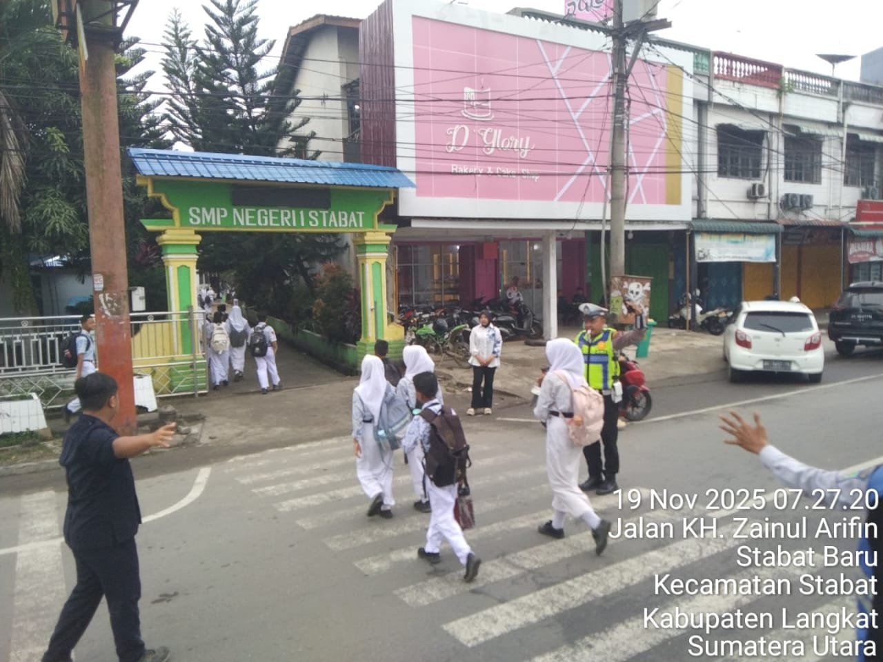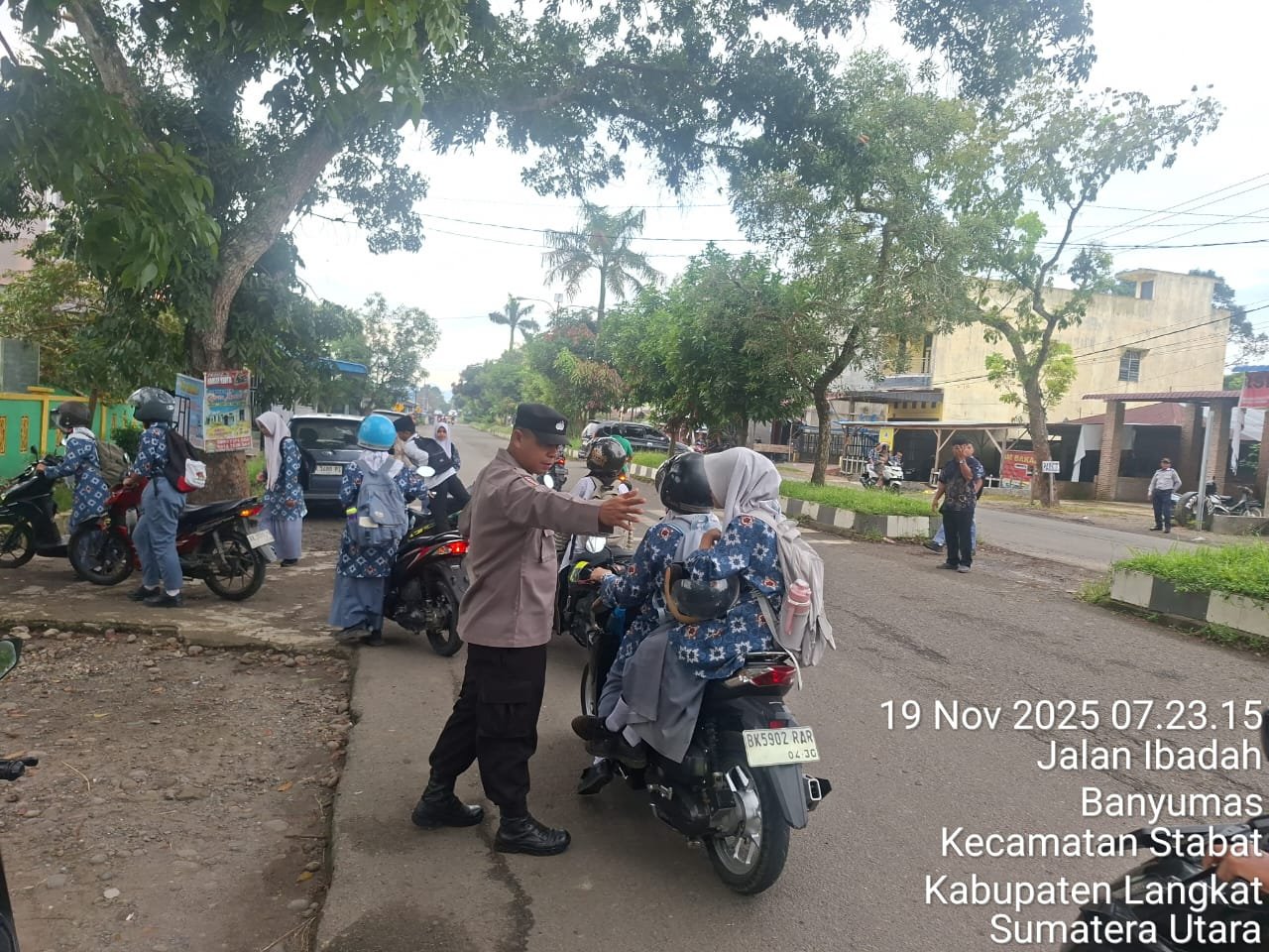 Personil Polres Langkat diterjunkan ke berbagai titik persimpangan dan area sekolah di penjuru kota dalam kegiatan “Strong Point Pagi” rutin.