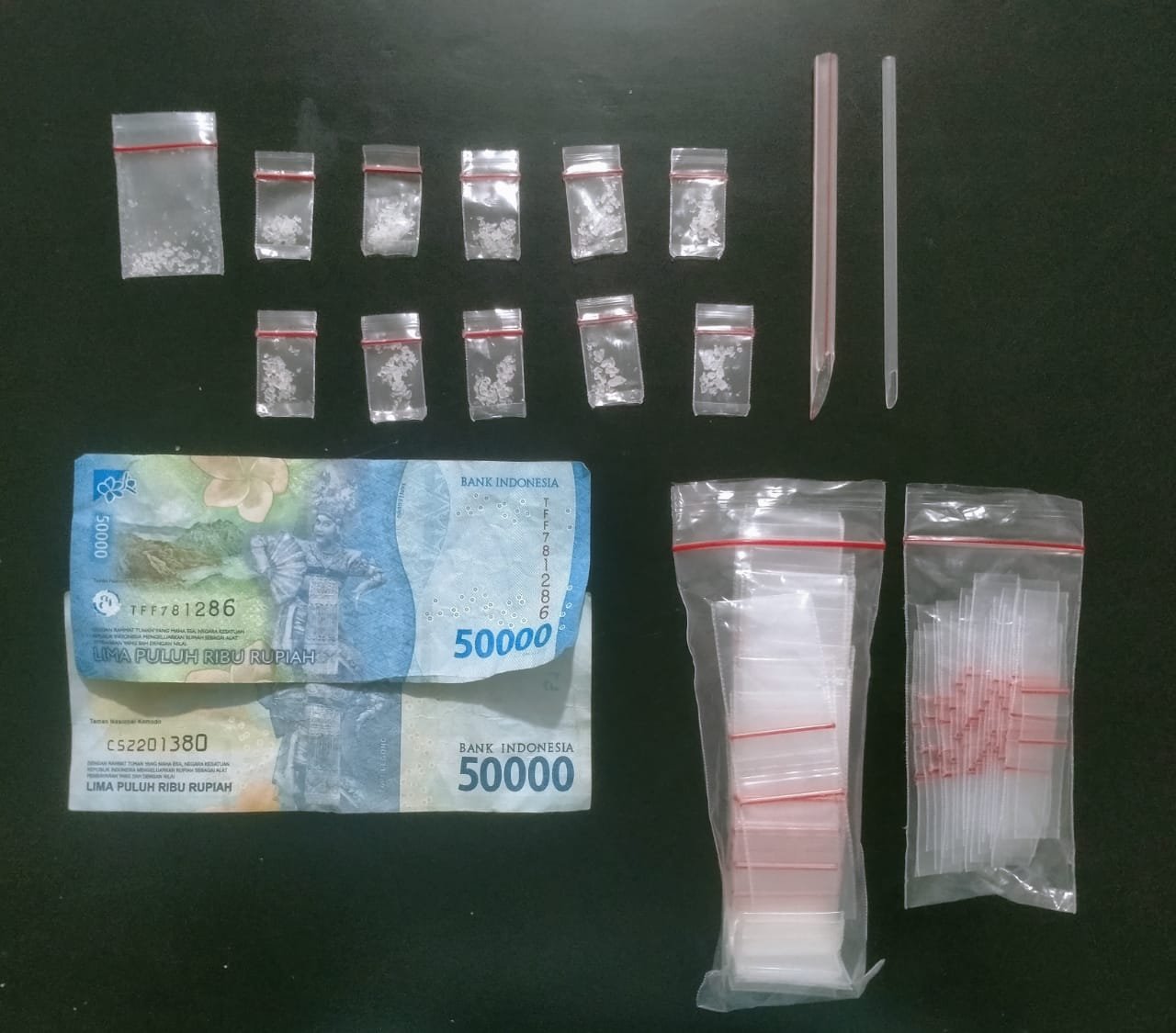 Adapun barang bukti yang diamankan antara lain: 11 (sebelas) helai plastik klip transparan berisi butiran kristal diduga sabu, 2 (dua) buah skop dari pipet, 2 (dua) bungkus plastik klip kosong, dan uang tunai senilai Rp100.000,-.
