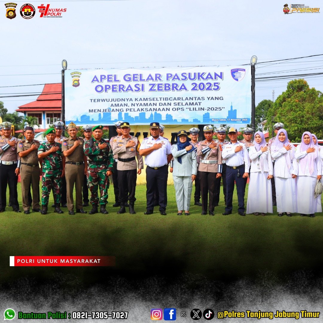 Tanjung Jabung Timur – Menjelang Operasi Lilin 2025, Polres Tanjung Jabung Timur gelar Operasi Zebra Siginjai 2025 dengan tema “Terwujudnya Kamseltibcarlantas Aman, Nyaman dan Selamat” bertempat di lapangan Apel Mako Polres Tanjab Timur, Senin (17/11/2025).