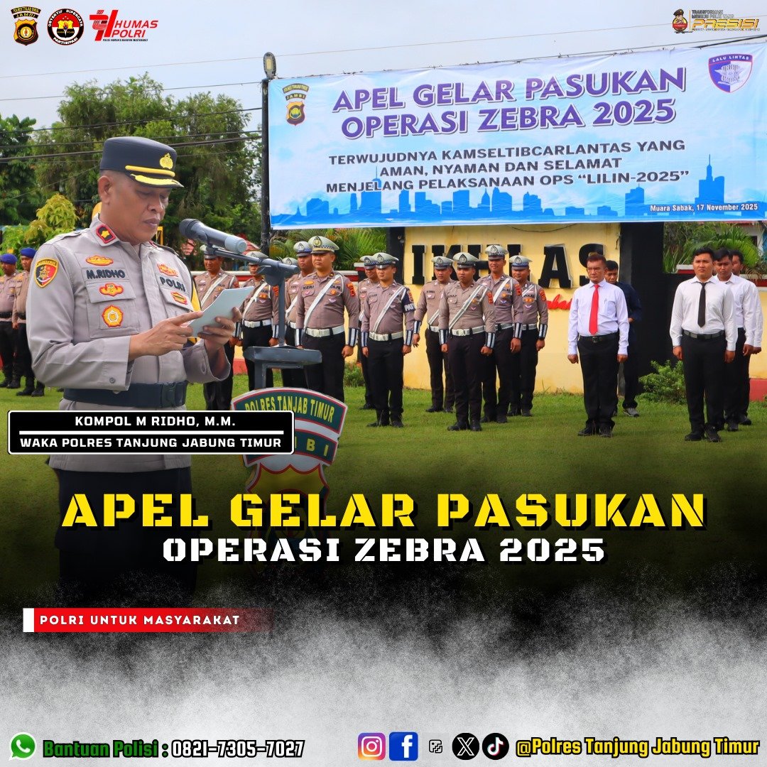 Tanjung Jabung Timur – Menjelang Operasi Lilin 2025, Polres Tanjung Jabung Timur gelar Operasi Zebra Siginjai 2025 dengan tema “Terwujudnya Kamseltibcarlantas Aman, Nyaman dan Selamat” bertempat di lapangan Apel Mako Polres Tanjab Timur, Senin (17/11/2025).