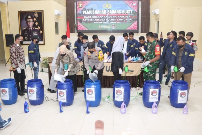 Banyuasin –mitramabes.com. Satuan Reserse Narkoba (Sat Resnarkoba) Polres Banyuasin menggelar pemusnahan barang bukti narkotika jenis sabu dengan total berat bersih mencapai 21.956,86 gram. Pemusnahan yang berlangsung pada Jumat siang (13/2) di aula sanika satyawada polres Banyuasin ini dipimpin langsung oleh Kapolres Banyuasin AKBP Risnan Aldino, S.I.K., M.Si.