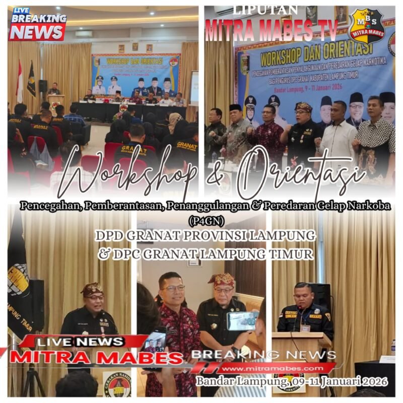 Diketahui, kegiatan Workshop dan Orientasi Penggiat Anti Narkoba Multistakeholders Kampung Bersinar (Bersih Narkoba) Kabupaten Lampung Timur, dilaksanakan bersama oleh DPD GRANAT Provinsi Lampung, Badan Narkotika Nasional (BNN) Provinsi Lampung, dan Pemda Kabupaten Lampung Timur, diikuti oleh 60 (enam puluh) orang peserta, terdiri dari Pengurus DPC GRANAT Kabupaten Lampung Timur, Unsur ASN, Tokoh Agama, dan Tokoh Masyarakat, dilaksanakan selama 3 (tiga) hari mulai 09-11 Januari 2026, di Hotel Alodia Bandar Lampung.