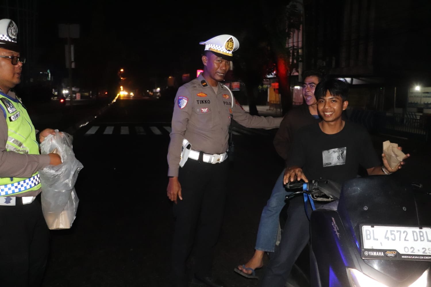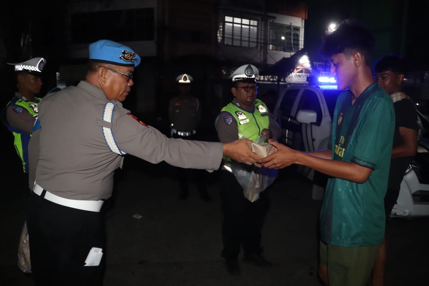 Sebanyak 100 bungkus nasi sahur dibagikan kepada masyarakat pengguna jalan serta warga yang masih beraktivitas menjelang waktu sahur. Selain berbagi makanan, personel juga menyampaikan imbauan kamtibmas agar masyarakat senantiasa tertib berlalu lintas, menggunakan helm, serta mengutamakan keselamatan dalam perjalanan, khususnya pada jam-jam dini hari.