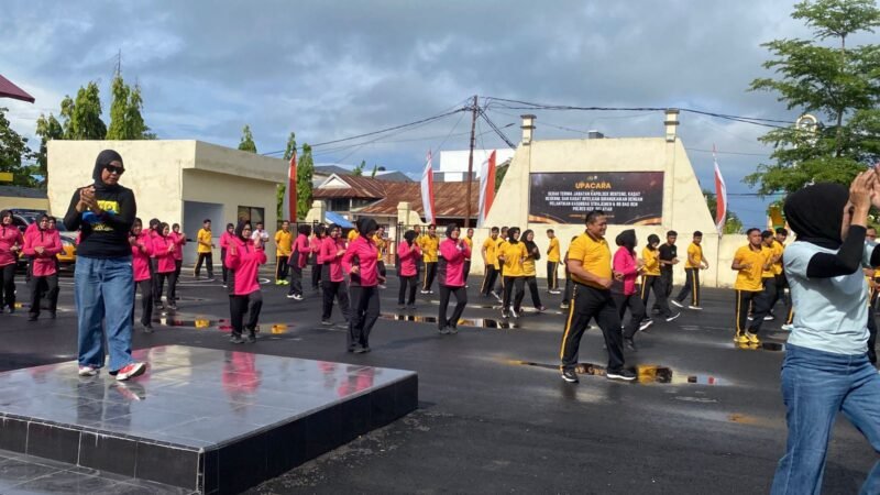 Olahraga bersama dilakukan dengan senam bersama dipandu oleh instruktur profesional yang dihadirkan khusus untuk memimpin jalannya kegiatan. Seluruh personel Polres, ASN, hingga anggota Bhayangkari tampak antusias mengikuti gerakan senam yang berlangsung penuh semangat dan suasana ceria.