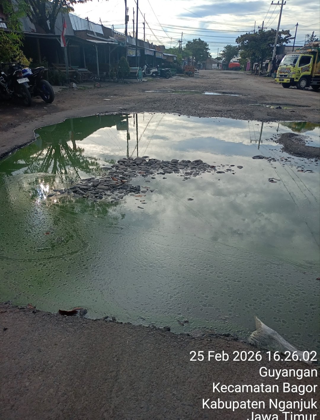 Mitramabes.com – Nganjuk — Kondisi Jalan Terminal Guyangan, Kecamatan Bagor, Kabupaten Nganjuk, Jawa Timur, kini menuai sorotan publik. Jalan yang seharusnya menjadi akses utama masyarakat justru berubah layaknya kolam air raksasa akibat kerusakan parah yang tak kunjung diperbaiki.