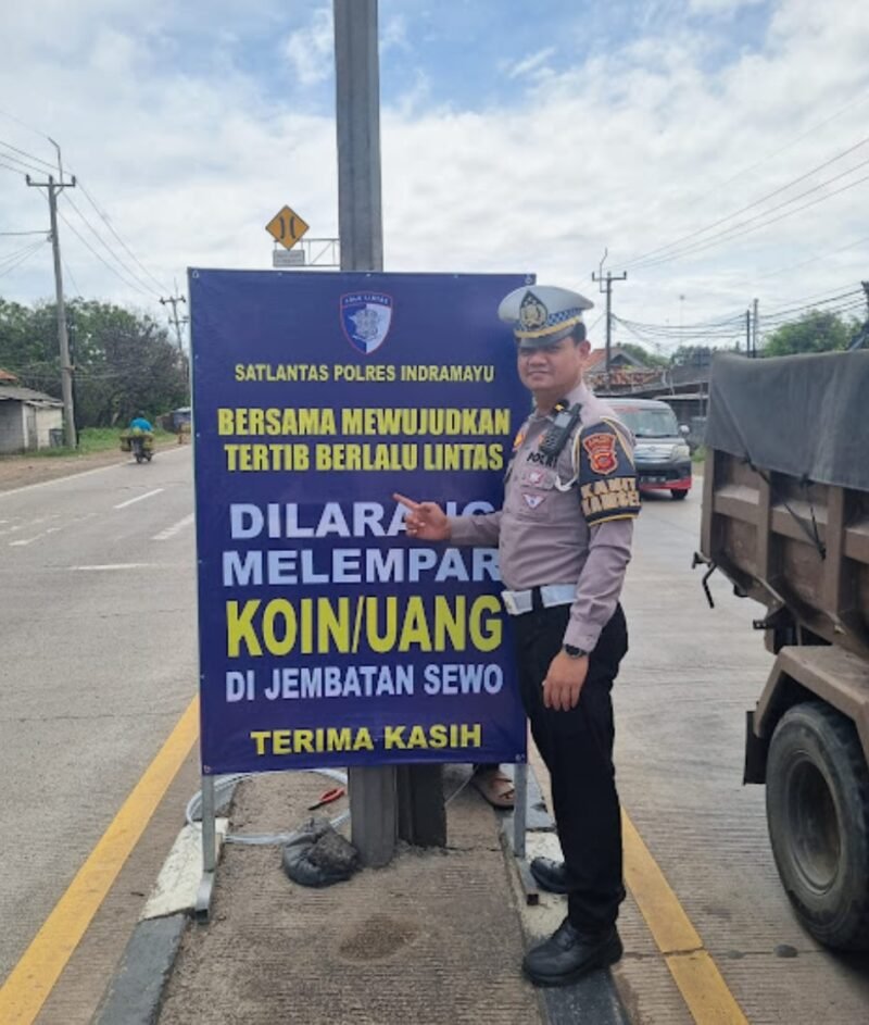 Kanit Kamsel Satlantas Polres Indramayu, IPDA Jeni Imanudin, S.H., memimpin pemasangan banner imbauan keselamatan yang berisi larangan membuang koin atau uang di area jembatan.