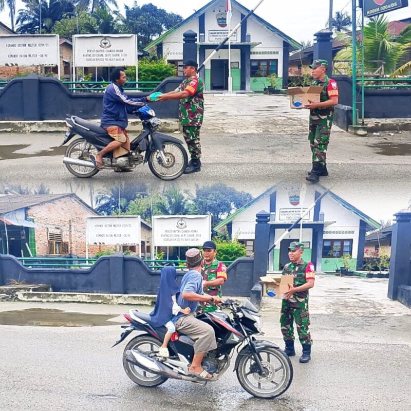 Kegiatan yang dimulai pagi ini dilaksanakan di sekitar Mako Koramil 08/PC, Desa Pantai Cermin Kanan, Kabupaten Serdang Bedagai, Sumut. Para Babinsa dibawah komando Danramil 08/PC Kapt. Inf. B.E. Sinaga, dengan penuh semangat membagikan nasi bungkus kepada warga masyarakat yang melintas.