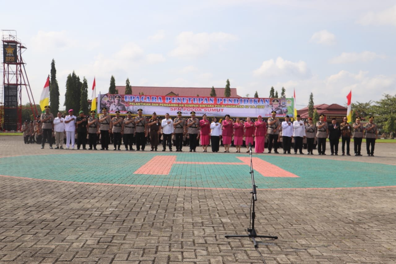 Kepolisian Daerah Sumatera Utara melaksanakan Upacara Penutupan, Pelantikan dan Pengambilan Sumpah Siswa Pendidikan Pembentukan Bintara (Diktukba) Polri Gelombang I Angkatan 52 Tahun Anggaran 2025. Kegiatan berlangsung di Lapangan Satya Haprabu SPN Hinai Polda Sumut, Desa Sukajadi, Kecamatan Hinai, Kabupaten Langkat, Rabu (24/12/2025).