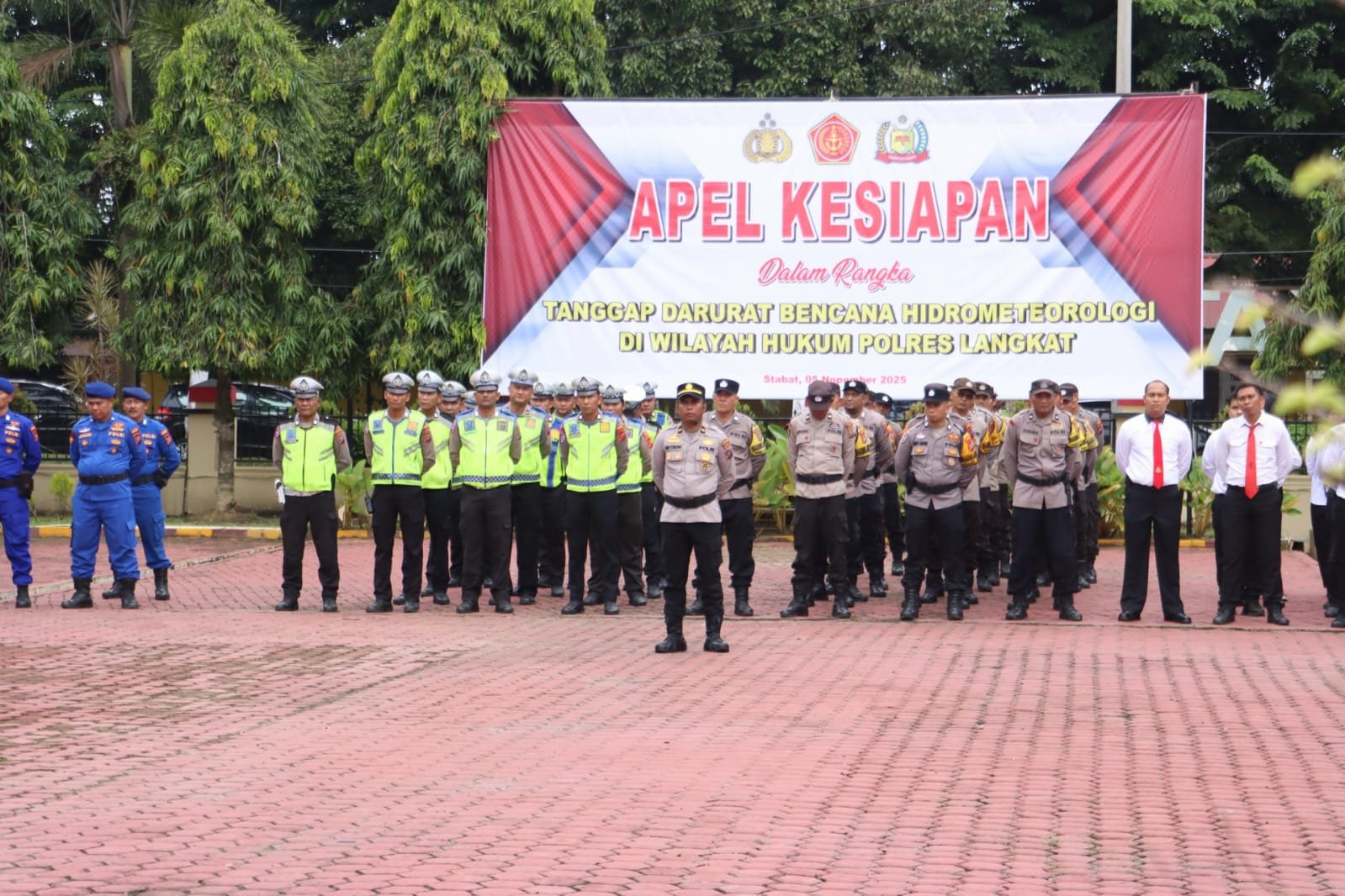 Dalam rangka memastikan kesiapsiagaan personel dan sarana prasarana menghadapi potensi bencana alam, Polres Langkat menggelar Apel Gelar pasukan Kesiapan Tanggap Darurat Bencana Tahun 2025. Kegiatan dipimpin langsung oleh Kapolres Langkat AKBP David Triyo Prasojo, S.H, S.I.K, M.Si., bertempat dilapangan apel Jananura Polres Langkat, Rabu (5/11/2025).
