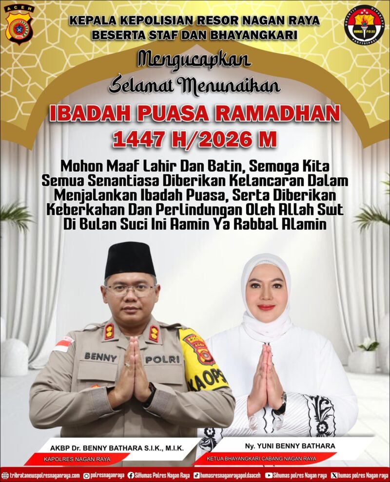 Suka Makmue-Mitra Mabes.com” Menjelang bulan suci Ramadhan 1447 H ( 2026) Masehi polres Nagan Raya serta jajaran selamat menunaikan ibadah puasa Ramadhan 1447 H / 2026 M, Kapolres mengajak masyarakat menjaga keamanan, ketertiban ( Kamtibmas) serta meningkatkan toleransi demi suasana Ramadhan, yang aman,nyaman, dan damai”Rabu 18 Februari 2026