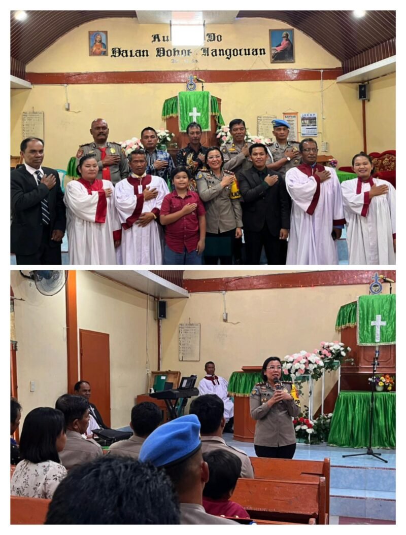 SAMOSIR – SUMUT, MBS – Kapolres Samosir AKBP Rina Sry Nirwana Tarigan, S.I.K., melaksanakan kunjungan sekaligus mengikuti Ibadah Minggu Gereja bersama umat HKBP Bonandolok Desa Bonan Dolok Kecamatan Sianjur Mulamula Kabupaten Samosir, Minggu (8/2/2026) sekitar pukul 11.00 WIB.