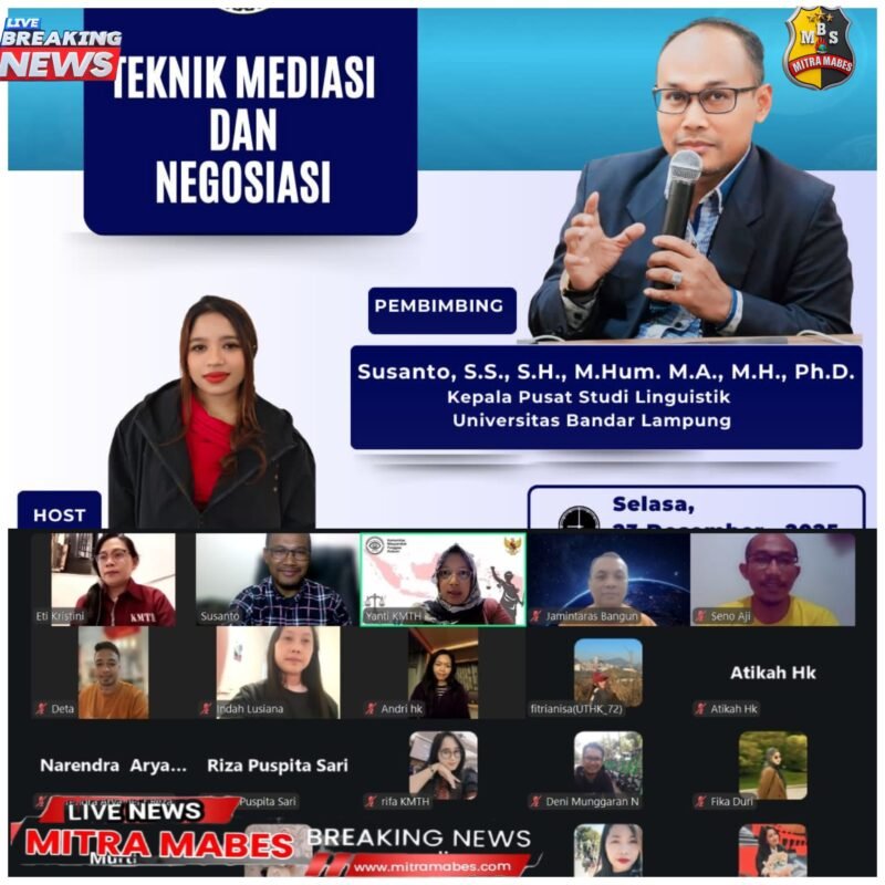 Acara yang berlangsung mulai pukul 22.00 HKT / 21.00 WIB melalui Zoom dan live streaming Facebook KMTH ini diikuti ratusan peserta dari Hong Kong serta negara lain melalui platform Zoom dan Facebook streaming. Mereka adalah PMI, praktisi hukum, mahasiswa, dan keluarga yang setiap hari menghadapi tantangan berat: gaji tak dibayar, PHK sepihak, kekerasan, penipuan, hingga perjuangan perceraian dan kewarganegaraan anak. Dipandu dengan penuh semangat oleh Fitrianisa Ronanda Raharja (Sekretaris KMTH), kelas ini menghadirkan Susanto, S.S., S.H., M.Hum., M.A., M.H., Ph.D., pakar linguistik forensik dari Universitas Bandar Lampung, yang dengan sabar dan bijak membagikan ilmu berharga tentang mediasi dan negosiasi sebagai jalan damai menyelesaikan konflik.