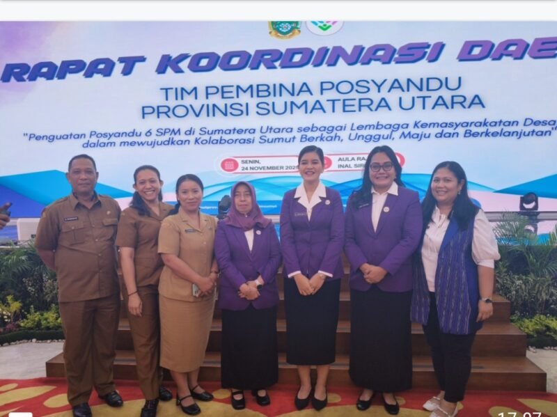 Ketua Tim Pembina Posyandu Kabupaten Tapanuli Utara Ny. Neny Angelina JTP Hutabarat didampingi Plt. Kepala Dinas Pemberdayaan Masyarakat dan Desa (PMD) Satya Dharma Nababan menghadiri Rapat Koordinasi Daerah (Rakorda) Posyandu tingkat Provinsi Sumatera Utara yang dilaksanakan di Aula Raja Inal Siregar, Kantor Gubernur Sumatera Utara, Medan (Senin, 24 November 2025).