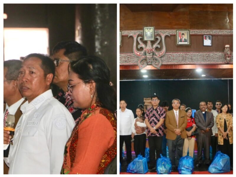 Pemerintah Kabupaten Tapanuli Utara menggelar Ibadah Doa Bersama bertema “Keselamatan Kabupaten Tapanuli Utara” sebagai wujud penguatan spiritual dan kepedulian bagi warga terdampak bencana, sekaligus menyalurkan bantuan yang diserahkan secara simbolis kepada perwakilan masyarakat dari Kecamatan Tarutung dan Siatas Barita bertempat di Gedung Kesenian Sopo Partungkoan, Tarutung (Jumat, 5/12/2025).