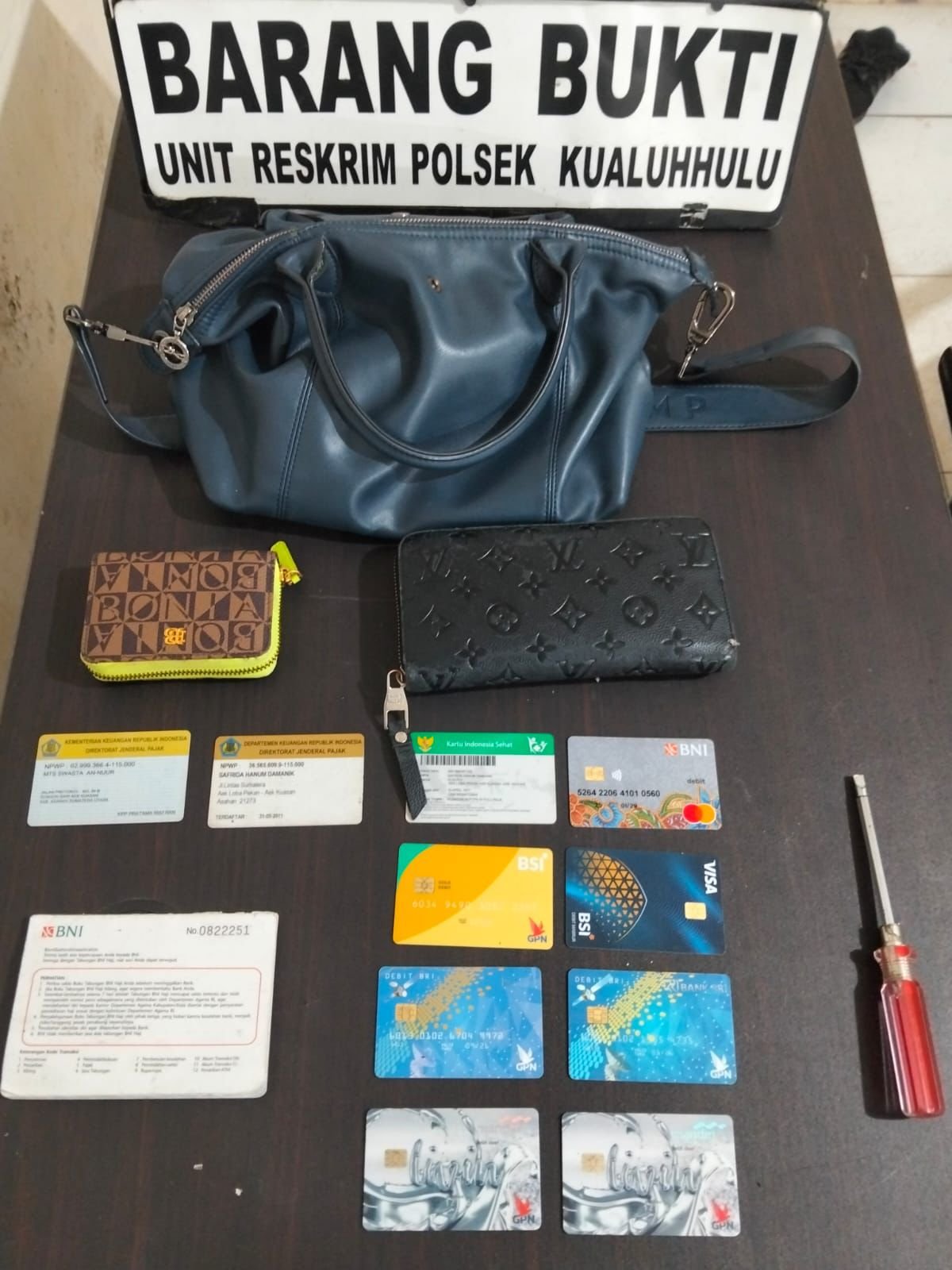 Pada hari Jumat tanggal 27 Februari 2026 sekira pukul 11.25 Wib, sewaktu Pelapor/korban selesai dari Bank Bsi dan melanjutkan perjalanan hendak pulang kerumah pelapor dan sesampainya di Tkp Jl Jend Sudirman Kel Aek Kanopan Kec Kualuh Hulu Kab Labuhanbatu Utara pelapor berhenti dengan maksud untuk belanja Ikan, dan selanjutnya pelapor memarkirkan mobilnya Agya warna merah BK 1660 EJ yang berjarak sepuluh meter dari tempat jualan ikan tersebut, dan ketika sedang memilih ikan pelapor mendengar ada terikan warga menerikan “Maling,Maling” dan selanjutnya salah satu warga memberitahukan kepada Pelapor/korban bahwasanya dari mobil ada tas yang dicuri, dan kemudian pelapor langsung bergegas mencek ke mobil dan melihat ada bekas congkelan pada pintu Mobil Sebelah Kanan Depan dan selanjutnya pelapor membuka pintu mobil tersebut dan melihat 1(satu) Buah Tas Sandang Warna Biru Tua telah dicuri dan diambil terlapor, ada pun isi dalam tas tersebut adalah 1. 1 (satu) buah tas sandang warna biru yang berisikan 1 (satu) buah buku tabungan BNI, 1 (satu) buah dompet kecil warna cokelat merk Bonia berisikan 2(dua) buah Kartu NPWP an. MTS Swasta An-Nuur dan SAFRIDA HANUM DAMANIK, dan 1 (satu) buah dompet warna hitam merk LV berisikan 1(satu) buah Kartu KIS an.SAFRIDA HANUM DAMANIK, 1 (satu) buah ATM BNI, 2(dua) buah ATM BRI, 2(dua) buah ATM BSI dan 2 (dua) buah ATM Mandiri dan selanjutnya para warga langsung mengejar pelaku dan berhasil mengamankan terlapor dan kemudian warga menyerahkan terlapor ke pihak yang berwajib Polsek Kualuh Hulu, sementara 1 (satu) orang lagi teman terlapor berhasil melarikan diri dan kemudian pelapor menyerahakan barang bukti tersebut ke polsek Kualuh Hulu. Atas kejadian tersebut kejadian tersebut pelapor/korban merasa keberatan dan pelapor mengalami kerugian Rp 5.000.000 (Lima Juta Rupiah) dan melaporkan kejadian tersebut ke Polsek Kualuh Hulu agar diproses sesuai dengan hukum yang berlaku di NKRI.