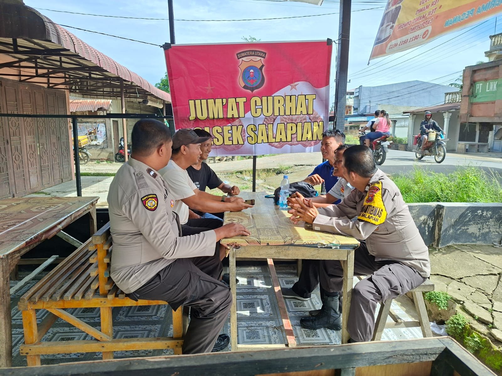 Bhabinkamtibmas Polsek Salapian Polres Langkat Aiptu Suranta Ginting mendengar berbagai keluhan masyarakat secara langsung melalui Program Jum’at Curhat di Warung Kopi yang berada di wilayah binaanya tepatnya di Kelurahan Tanjung Langkat Kecamatan Salapian Kabupaten Langkat Jumat 24 Oktober 2025.