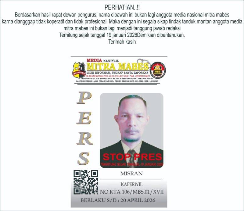 “Sejak tanggal 19 Januari 2026, Misran sudah tidak memiliki kewenangan apa pun, baik secara jurnalistik maupun struktural di Media Mitra Mabes. Segala aktivitas, pernyataan, atau tindakan yang mengatasnamakan Mitra Mabes bukan menjadi tanggung jawab redaksi,” tegas pihak manajemen.