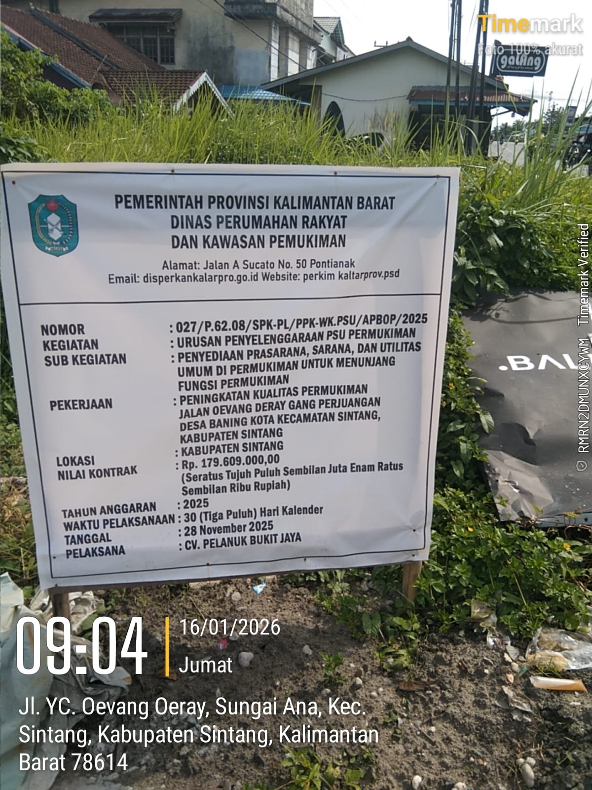 KALIMANTAN BARAT ,Mitramabes.com Pelaksanaan proyek Peningkatan Kualitas Permukiman milik Dinas Perumahan dan Kawasan Permukiman (Perkim) Provinsi Kalimantan Barat yang berlokasi di Jalan Oevang Deray, Gang Perjuangan, Desa Baning, Kecamatan Sintang, menuai sorotan tajam dari masyarakat.