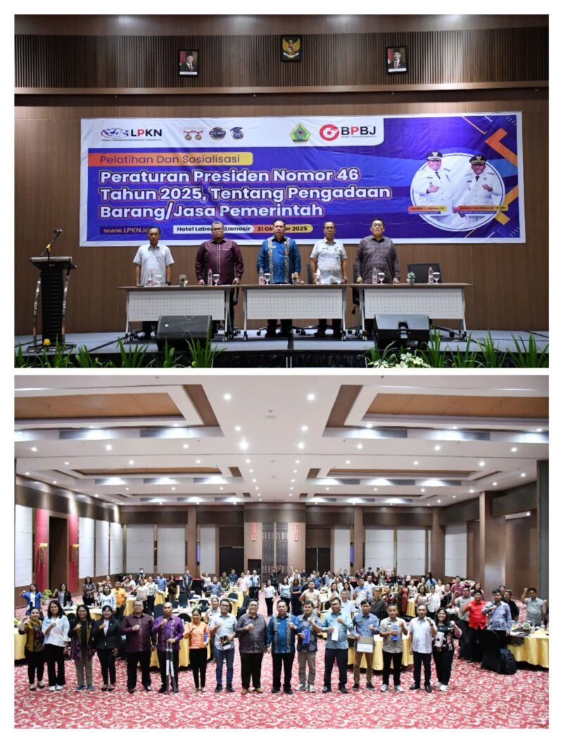 Samosir- Sumut – Pemerintah Kabupaten Samosir melalui Unit Kerja Pengadaan Barang/Jasa (UKPBJ) menyelenggarakan Pelatihan dan Sosialisasi Perpres Nomor 46 Tahun 2025 Tentang Pengadaan Barang dan Jasa Pemerintah. Perpres ini merupakan perubahan kedua atas Perpres No. 16 Tahun 2018. Kegiatan ini dirancang untuk peningkatan kapasitas dan kapabilitas sumber daya manusia aparatur Pemkab. Samosir. Meningkatkan transparansi, efisiensi, dan akuntabilitas dalam pengadaan barang/jasa pemerintah. Acara dibuka resmi oleh Bupati Samosir diwakili Asisten II Hotraja Sitanggang di Hotel Labersa, Jumat 31/10.